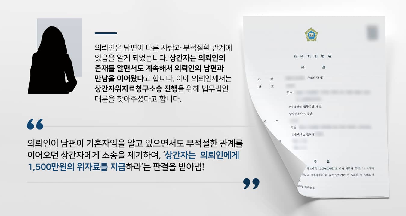 그런데 C는 B가 유부남이라는 사실을 몰랐다고 강하게 항변했다며 회사 동료이긴 했지만 결혼은 자신이 입사 전에야 혼인 사실을 몰랐고, 직장생활이나 외도 과정에서 가족에 대해 전혀 발언하지 않아 유부남인 점을 전혀 몰랐다고 주장한 것입니다.그러나 A는 소송대리인의 도움을 받아 남편과 C의 메신저 대화 내용을 모두 검토했고, C가 해당 사실을 알 수 있었다고 볼 만한 대화를 증거로 제출했으며, 이 외에도 다양한 입증책임을 다한 결과 승소할 수 있었다고 말했습니다. 이처럼 위자료 소송에서 상대방이 혼인관계에 대해 몰랐다고 주장하는 경우가 많지만 증거를 면밀히 검토해야 상대방의 주장을 반박할 수 있기 때문에 너무 조급해 할 필요는 없다고 조언했습니다.