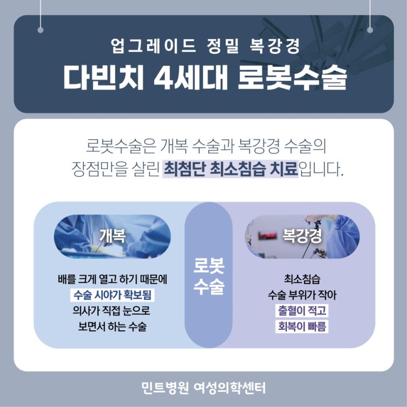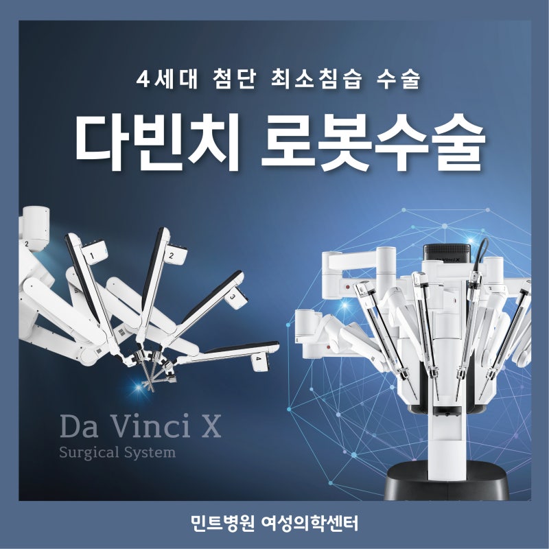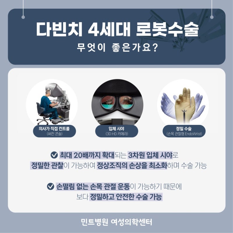 다빈치 로봇수술은 작은 절개창을 통해 로봇팔을 삽입해 위를 열지 않고 병변을 제거하는 침습적 시술이다. 정확도를 높이고 수술시간을 단축시켜 환자의 부담을 줄이고 안정적이고 빠른 회복을 이루는 자궁선근종의 보다 정밀한 치료, 방법입니다. 이전 수술의 제한된 부분을 모두 다루는 시술입니다. 모션 컨트롤과 리셋 기능으로 손 떨림 없이 안정적이고 섬세하며 정밀한 수술이 가능합니다.