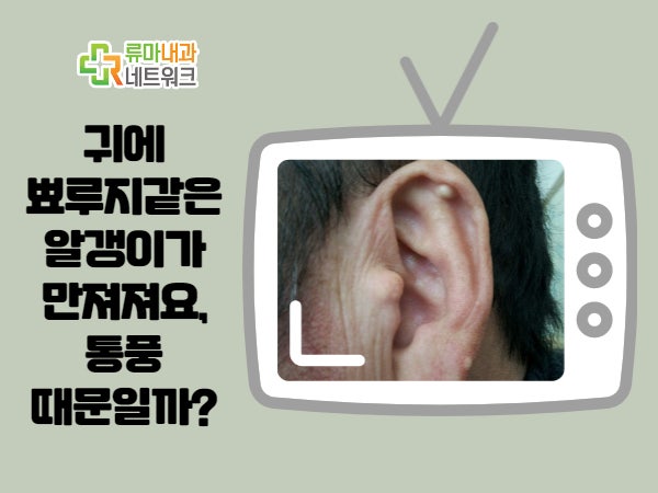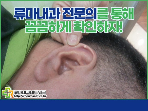 통풍은 요산 결절에 의한 염증으로 인한 발작으로 많은 분들이 알고 계시겠지만 엄지발가락 등의 발가락을 공격한다고 할 수 있는데 요산 결절이 귀에 쌓이게 되어 통풍이 발생하게 됩니다. 구진을 의심할 수 있는 지점까지. 어떤 경우에는 흰색 결절이 보일 수 있습니다.