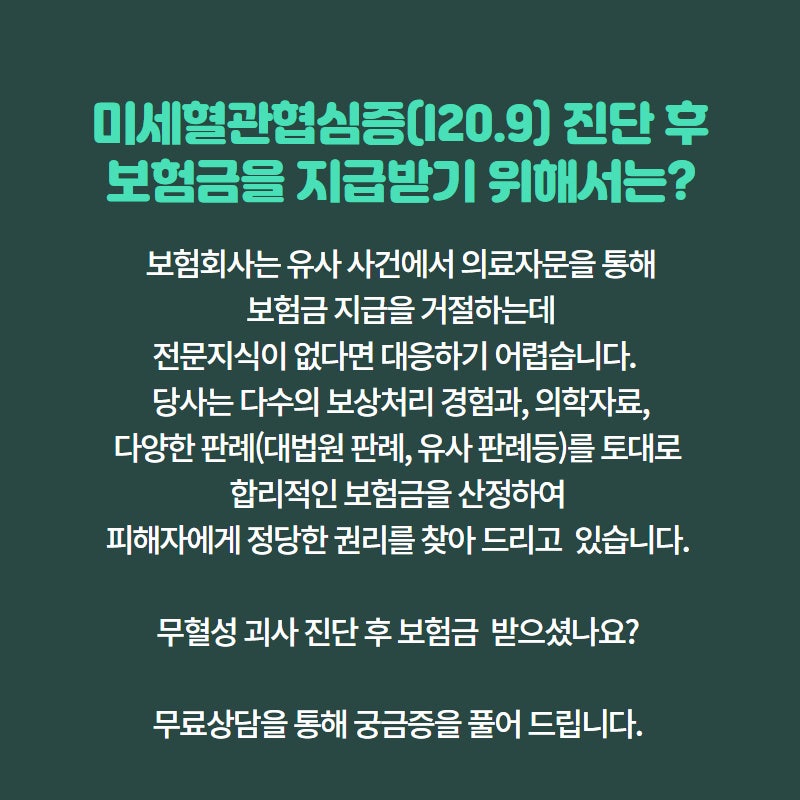 보험 분쟁 전문가 손해 사정사손해사정사는 보험분쟁 전문가입니다. 손해액을 산정하고 보험금면, 부책을 판단하는 사람으로 보험사도 보험분쟁이 예상되면 손해사정사를 현장에 파견하여 보험금 감액, 거절 등의 근거를 확보하고자 합니다.이처럼 소비자도 본인을 위한 손해사정사를 선임해 현명하게 보험금 분쟁에 대비해야 합니다.당사로 I20.9 상세불명의 협심증, 미세혈관협심증에 대해 문의하시면 신체손해사정사, 재물손해사정사 자격의 전문손해사정사가 의뢰인의 보험금 청구권을 신속하게 분석하여 양질의 무료상담을 진행하고 있습니다! 망설이지 마시고 연락주세요!보상의 길이 열립니다!당사로 I20.9 상세불명의 협심증, 미세혈관협심증에 대해 문의하시면 신체손해사정사, 재물손해사정사 자격의 전문손해사정사가 의뢰인의 보험금 청구권을 신속하게 분석하여 양질의 무료상담을 진행하고 있습니다! 망설이지 마시고 연락주세요!보상의 길이 열립니다!당사로 I20.9 상세불명의 협심증, 미세혈관협심증에 대해 문의하시면 신체손해사정사, 재물손해사정사 자격의 전문손해사정사가 의뢰인의 보험금 청구권을 신속하게 분석하여 양질의 무료상담을 진행하고 있습니다! 망설이지 마시고 연락주세요!보상의 길이 열립니다!